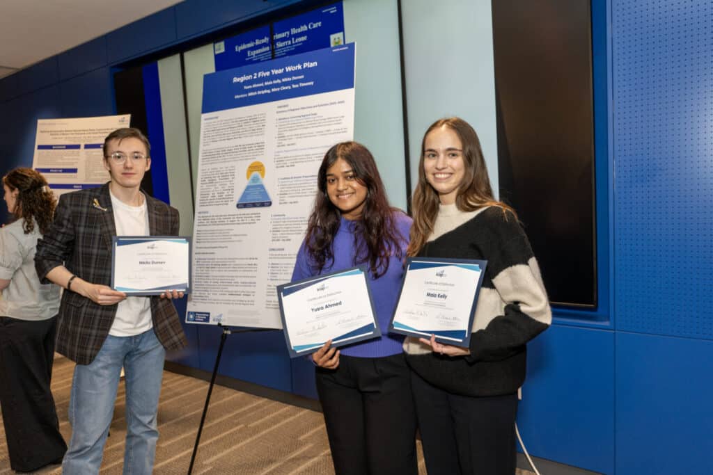Maia Kelly, Nikita Durnev, and Yusra Ahmed received certificates of distinction for their contributions to a public health preparedness workplan for the Preparedness and Recovery Institute.